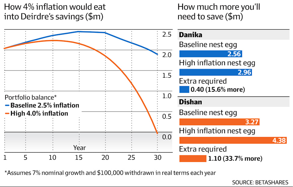 这个问题同样适用于丹妮卡和迪山。不过在看哪些资产在高通胀环境下 historically 表现较好之前,我们先来看看,更高的通胀会怎样影响丹妮卡和迪山希望在退休时,积累出一笔按今天币值计算为200万澳元的目标。