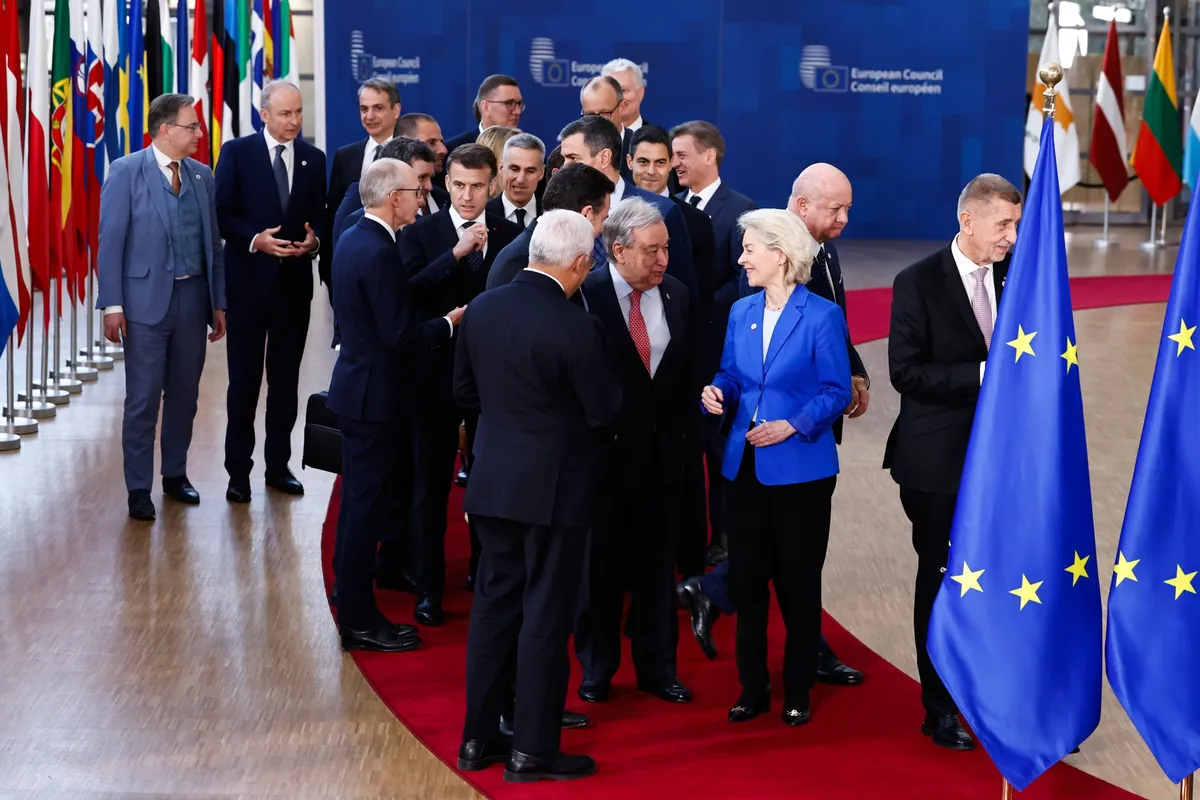 2026年3月19日,联合国秘书长古特雷斯在布鲁塞尔举行的欧洲理事会会议上,与欧盟国家领导人会面。