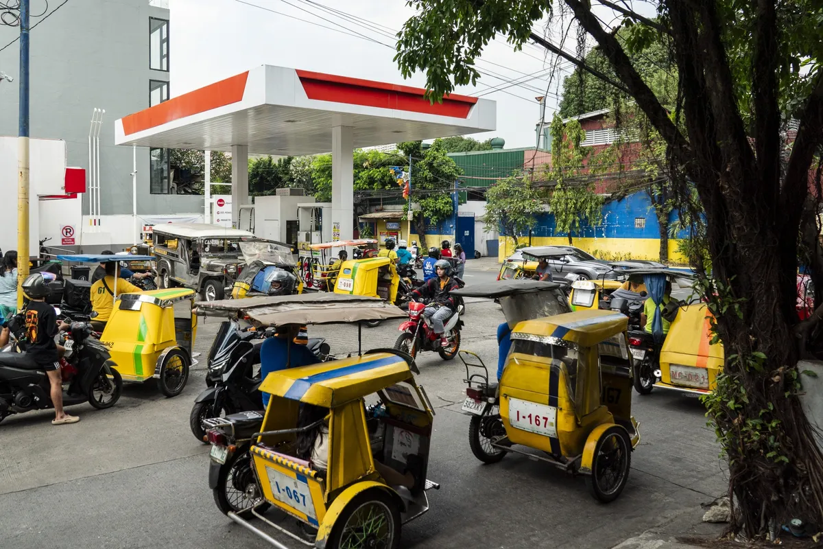 2026年3月26日,菲律宾曼达卢永,一辆辆机动三轮车和摩托车在加油站前排队。该国已宣布进入全国能源紧急状态。