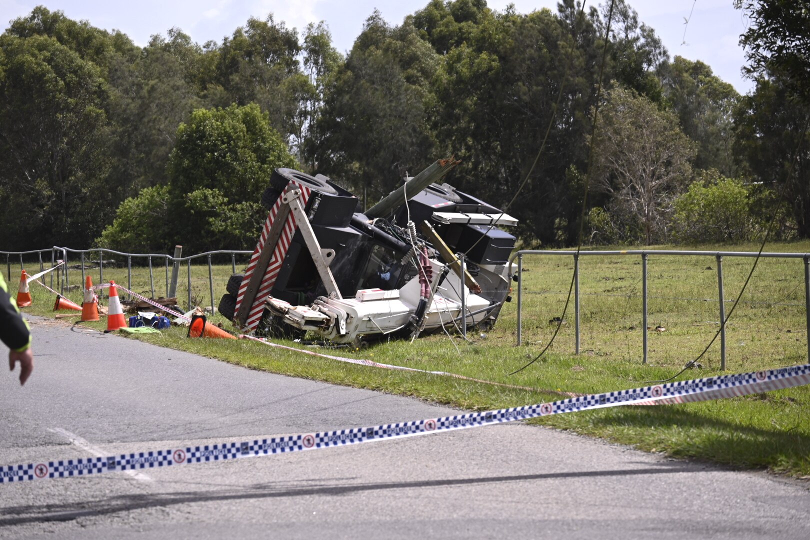 一男子乘坐的起重机在布里斯班东部翻倒并砸到电线后生命垂危。